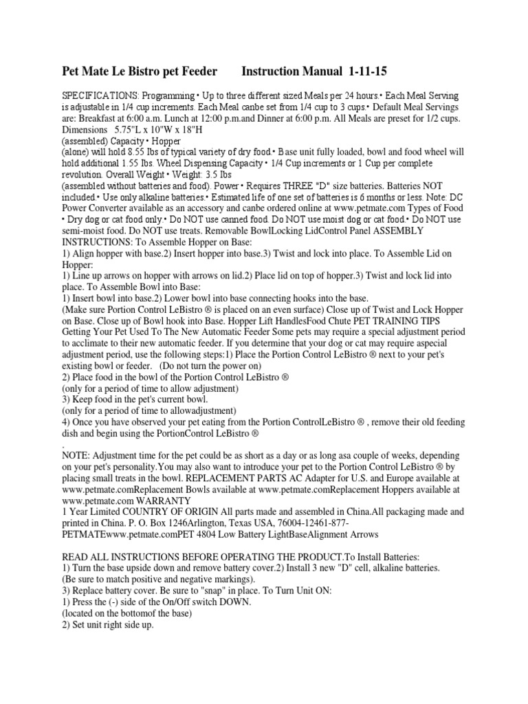 Don't forget to bookmark petmate le bistro portion control automatic pet feeder manual using Ctrl + D (PC) or Command + D (macos). If you are using mobile phone, you could also use menu drawer from browser. Whether it's Windows, Mac, iOs or Android, you will be able to download the images using download button.