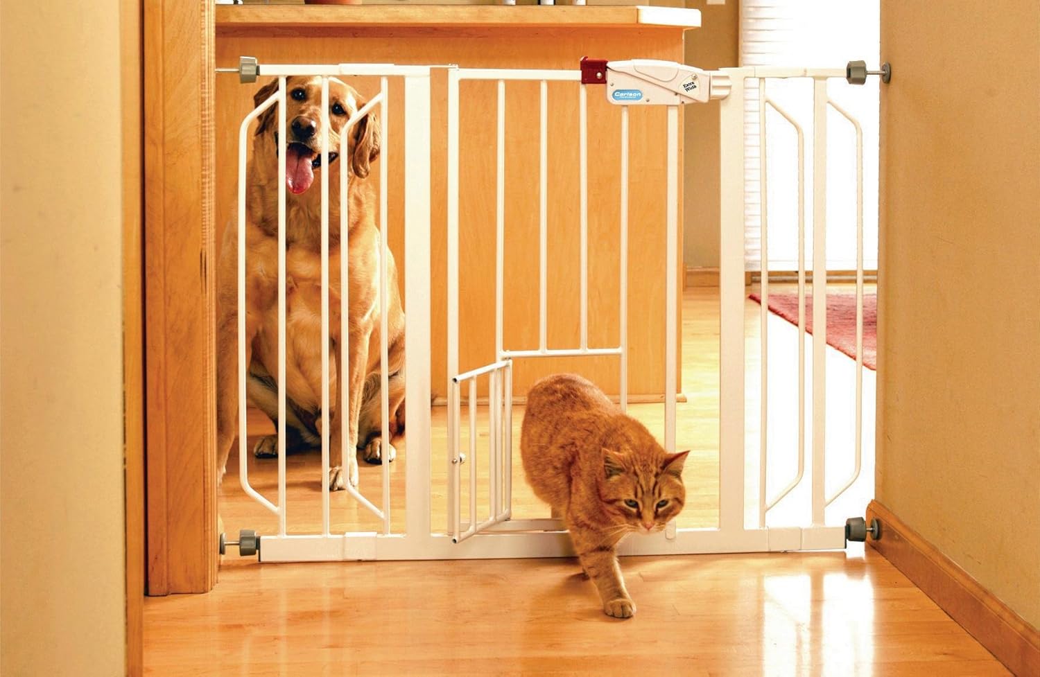 Carlson pet products extra wide gate pet gate sturdy construction quick installation. Each of the four pressure mounts can be adjusted to create a stable and secure fit. Carlson home design extra tall walk thru pet gate with small pet door includes decor hardwood 4 inch extension kit 4 inch extension kit 4 pack of pressure mount kit and 4 pack of wall mount kit.