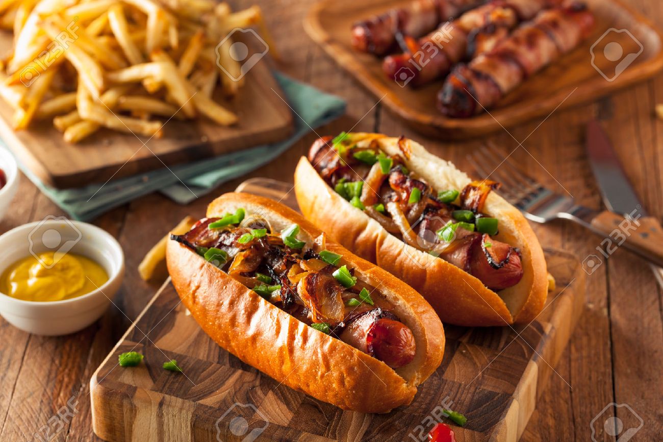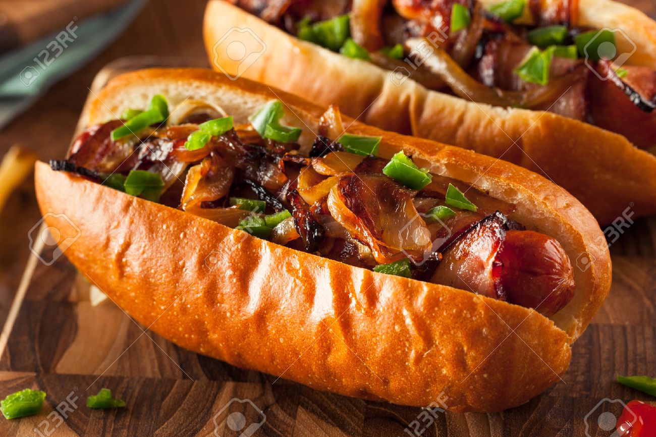 Homemade Bacon Wrapped Hot Dogs With Onions And Peppers