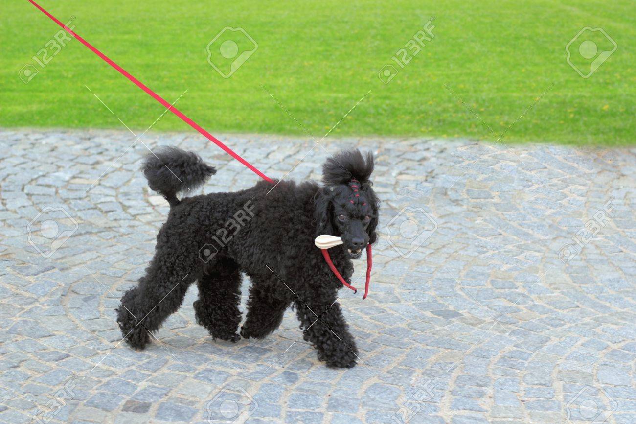 Caniche Breed Ugly Black Dog Walking In The Park With A Bone